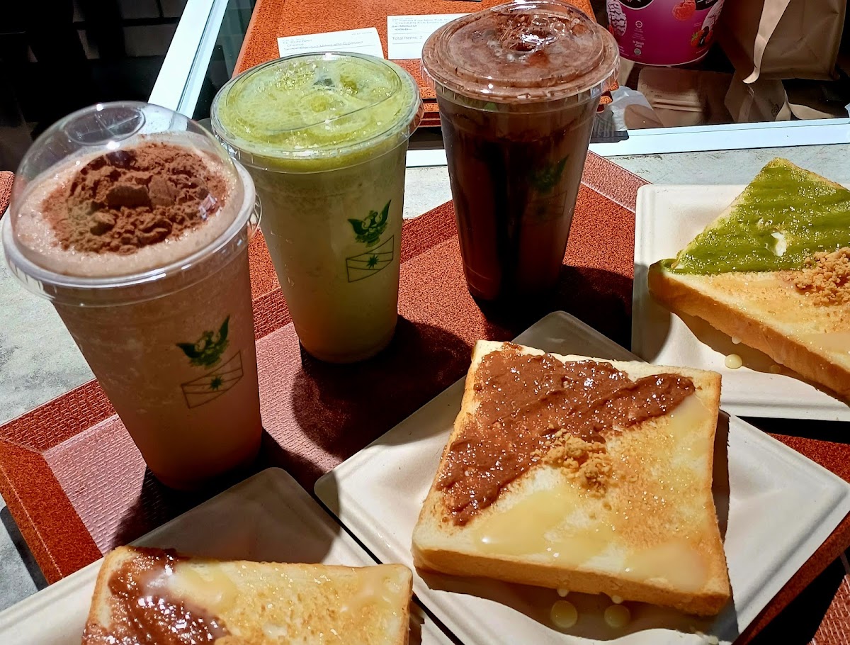 we were greeted upon entering the shop. a warm welcome i love the cafe vibe where i can chill a bit after walking around kuching city. i ordered their drinks it was nice and authentic. if you guys love dark chocolate and authentic ones, this shop got your back. i tasted their mocha, it was bittersweet and good for those who want to taste real dark chocolate. there's also upstairs for chill and do your work. got plenty of sockets too. each table have their socket supply. suitable for those who wanna do their work while enjoying drinks and food. this place is a huge yes the bread taste good and it's the original spread of matcha, milo and milk. they gave us free ice cream for this review